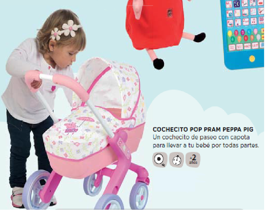 Nesta imaxe móstrase unha nena exercendo de coidadora dun bebé, o que contribúe a identificar o xénero femenino con roles da responsabilidade familiar, atención aos fillos, coidados no fogar e unha vez máis a cor que está en maior proporción é o rosa.
