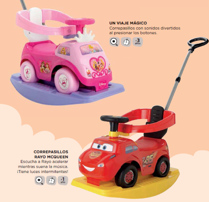 Aquí vemos unha estratexia de venta que consiste en diferenciar a quen se dirixe o produto mediante o diseño de cada xoguete. O coche que está dirixido ás nenas ten un diseño de princesas e é de cor rosa, mentres que o que se lle quere vender aos nenos ten un diseño de Rayo Mcqueen, con cores máis intensos e potentes. Incluso se nos fixamos na descripción de cada produto vemos que no coche rosa se define como "divertido" e en cambio no coche vermello para os nenos destácase a velocidade mediante o son do coche cando acelera. Polo tanto o coche feminino relacionase coa diversión cos sons e o masculino ca velocidade e a competición.